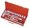 Cr-V 26PC Socket Set model:DHZ018 1/2" 26pcs sokcet wrench set 18 pc 6pt socket (10,11,12,13,14,15,16,17,18,19,20,21,22,23,24,27,30,32)mm 1 pc ratchet wrench 1 pc universal joint 2 pc extension bar: 5" & 10" 1 pc 3 way adapter 1 pc spark plug socket: 21mm 1 pc flexible handle 1 pc metal box